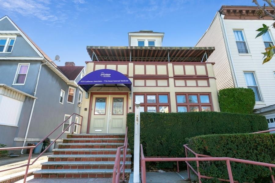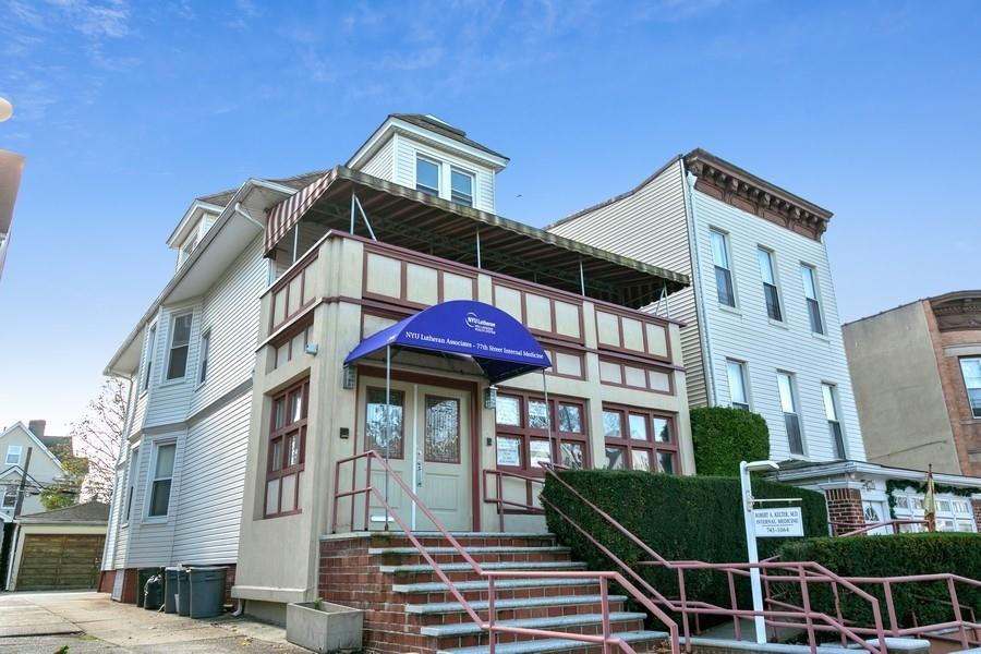 OVERSIZED DETACHED MIXED USE PROPERTY WITH DETACHED 2 CAR GARAGE IN THE HEART OF BAY RIDGE. The main floor features a fully furnished medical office that is in move in condition, handicap accessible via a ramp and has a Certificate of Occupancy. This functional office includes a windowed waiting room, a windowed consultation room, three examination rooms, a business/reception area, two ADA restrooms, central HVAC, kitchenette and plenty of storage. Situated just steps from the R train and multiple MTA bus stops, this is the ideal location for a growing practice. A large duplex apartment occupies the second and third floor with a “home” entry from the front and back of the building. The apartment has great light exposure with a full bathroom, kitchen, formal dining room, office/3rd bedroom plus a living room that opens onto a large second floor balcony. The third floor contains two bedrooms, a full bathroom and plenty of closet space. The full unfinished basement has laundry and access to the large backyard with a detached two car garage and clear access for off street parking of two additional cars.